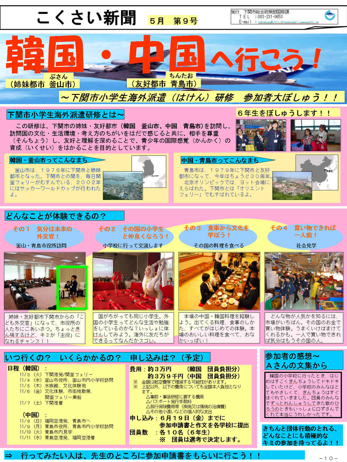 - 2011年5月号 小学生韓国・中国派遣研修の募集